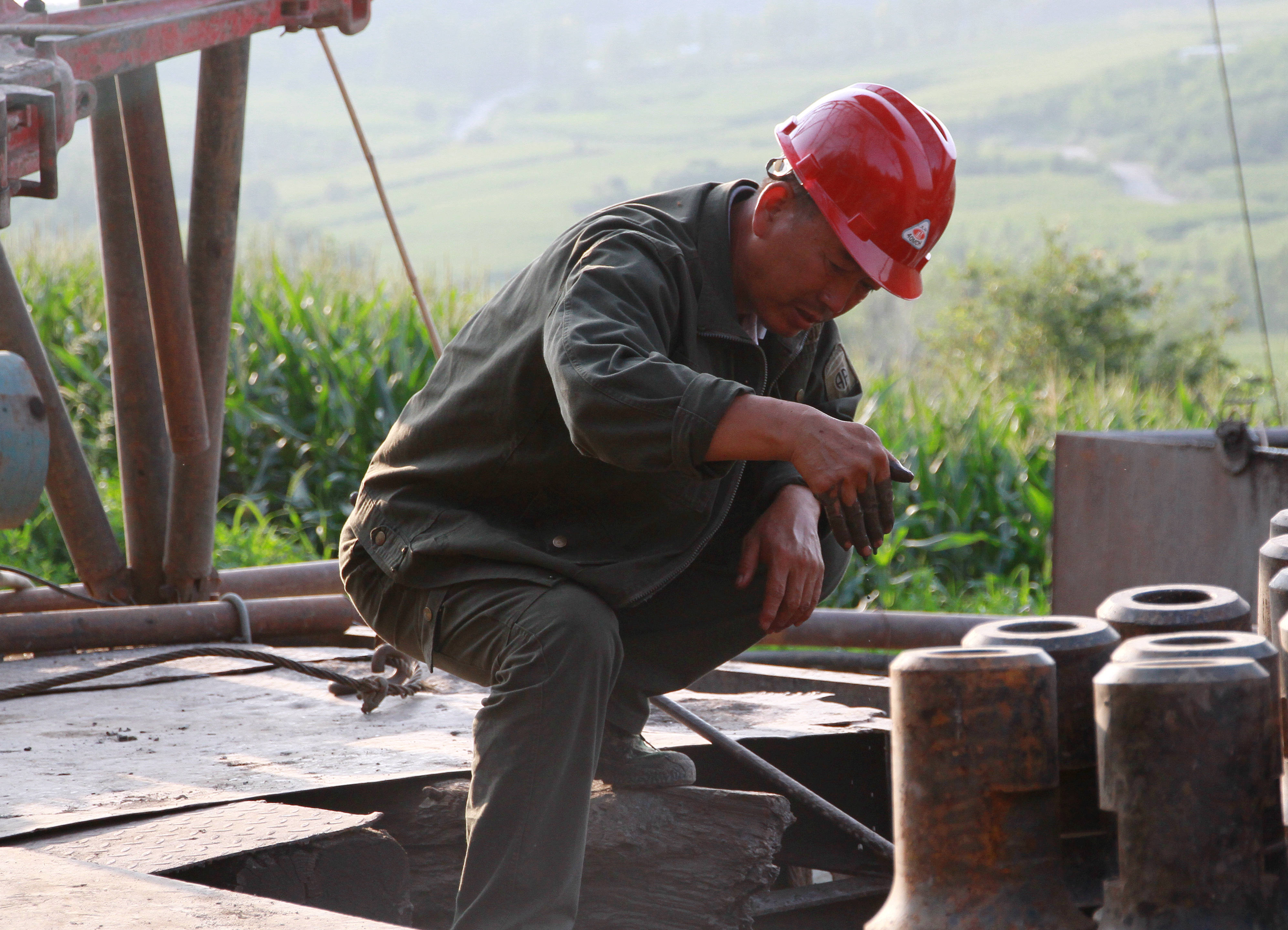 陈合才在钻机施工现场检查吊钳清静状态