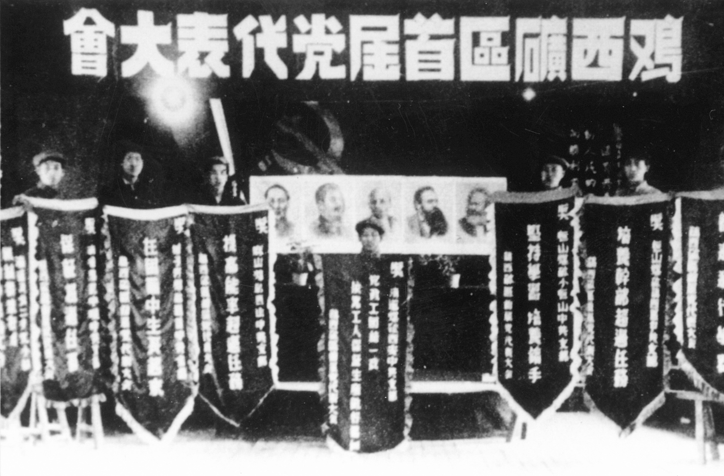 1948Äê10Ô£¬Öй²¼¦Î÷¿óÇøÎ¯Ô±»á½¨É衣ͼΪ¼¦Î÷¿óÇøÊ׽쵳´ú»á»á³¡
