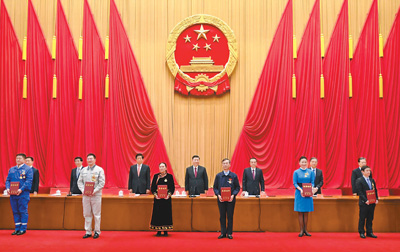 在欢快的乐曲声中,天下劳动模范和先进事情者代表依次登上主席台,习近一律为他们揭晓声誉证书。