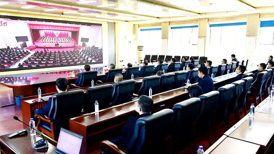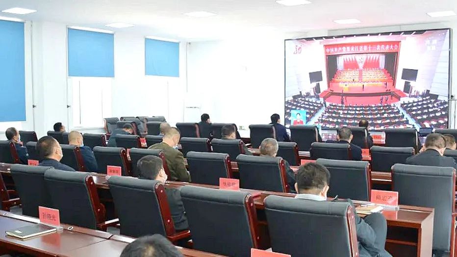在七矿公司机关三楼调理聚会室 ,该公司向导与机关党员干部和职工早早来到这里期待寓目中国共产党黑龙江省第十三次代表大会开幕会直播盛况。