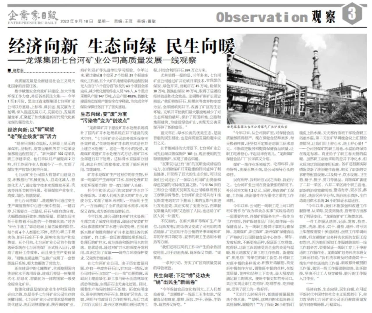 ¡¶ÆóÒµ¼ÒÈÕ±¨¡·2023Äê9ÔÂ18ÈÕÈý°æÓÚÏÔÖøÎ»Öÿ¯·¢ÎÄÕ£º¡¶¾­¼ÃÏòРÉú̬ÏòÂÌ ÃñÉúÏòů ¡ª¡ªBOB¹ú¼ÊÔÚÏß¼¯ÍÅÆß̨ºÓ¿óÒµ¹«Ë¾¸ßÖÊÁ¿Éú³¤Ò»ÏßÊӲ졷£¬È«ÎÄÈçÏ£º