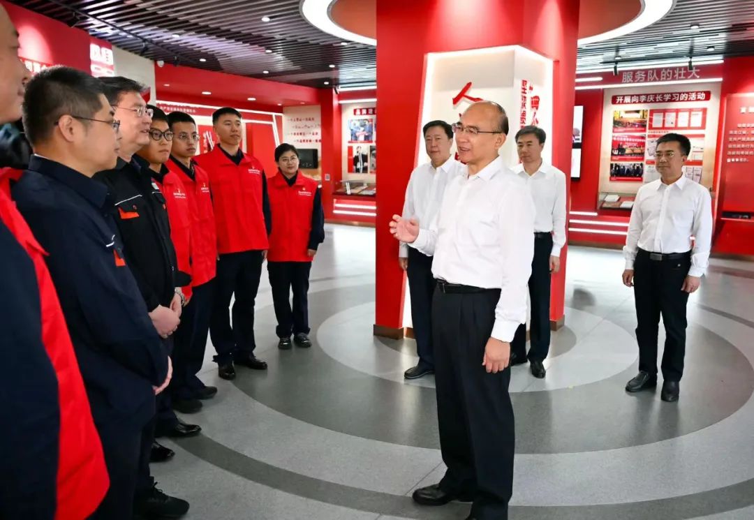 在国网黑龙江电力李庆长共产党员服务队,许勤听取服务队生长历程、先进事迹等情形先容后与共产党员服务队队员交流